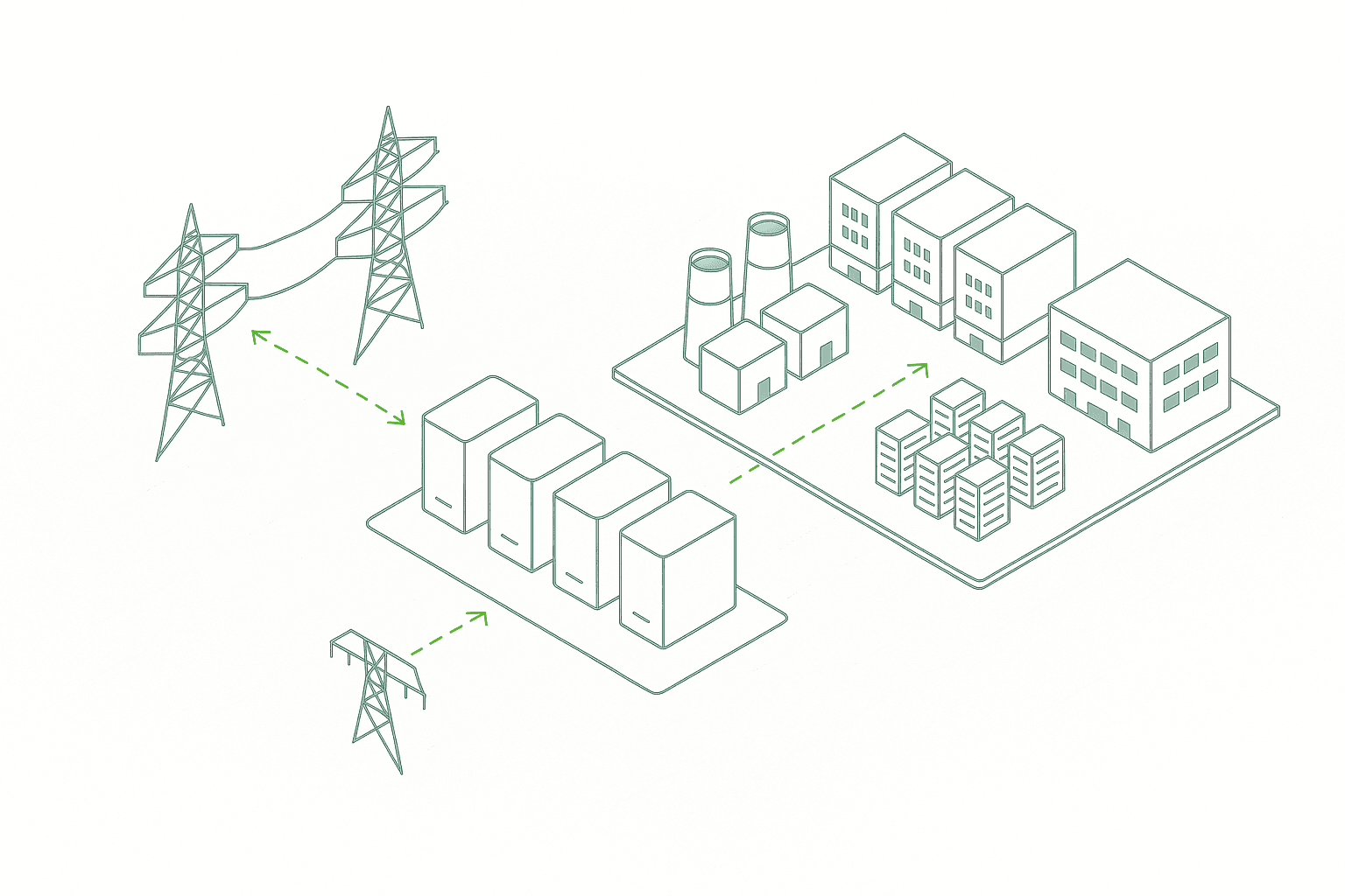 We deliver an on-site BESS “power layer” that lets large compute campuses connect sooner and run better. The system smooths AI load swings, rides through faults, and time-shifts grid draw to lower-stress hours—improving interconnection outcomes, power quality, and total cost of ownership.